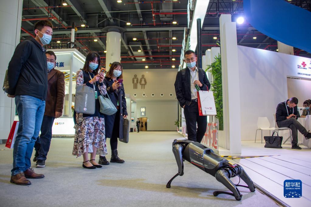 11月20日,参观者在“5G+工业互联网成果展”现场与仿真机器狗互动。