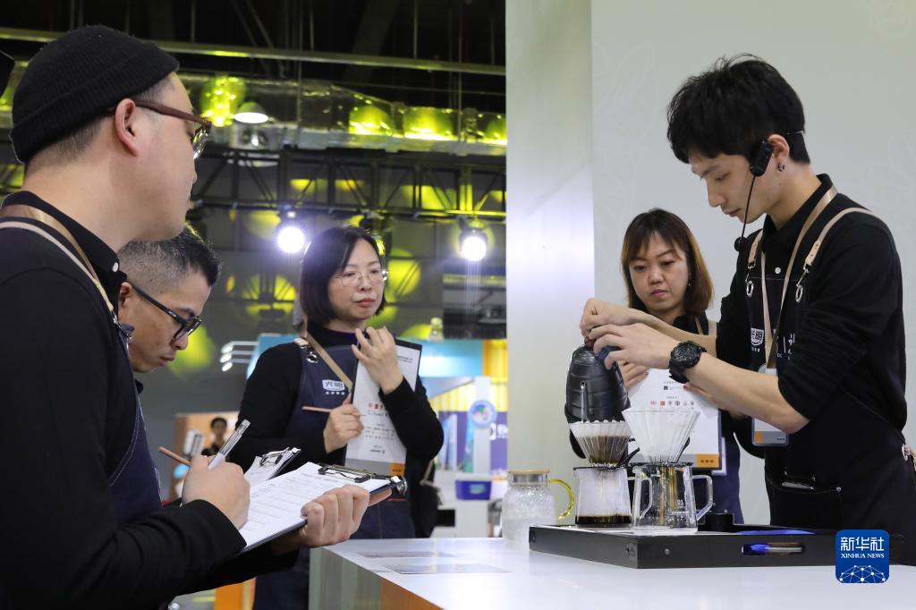 11月20日,一名选手(右一)在手冲咖啡比赛项目中进行演示。