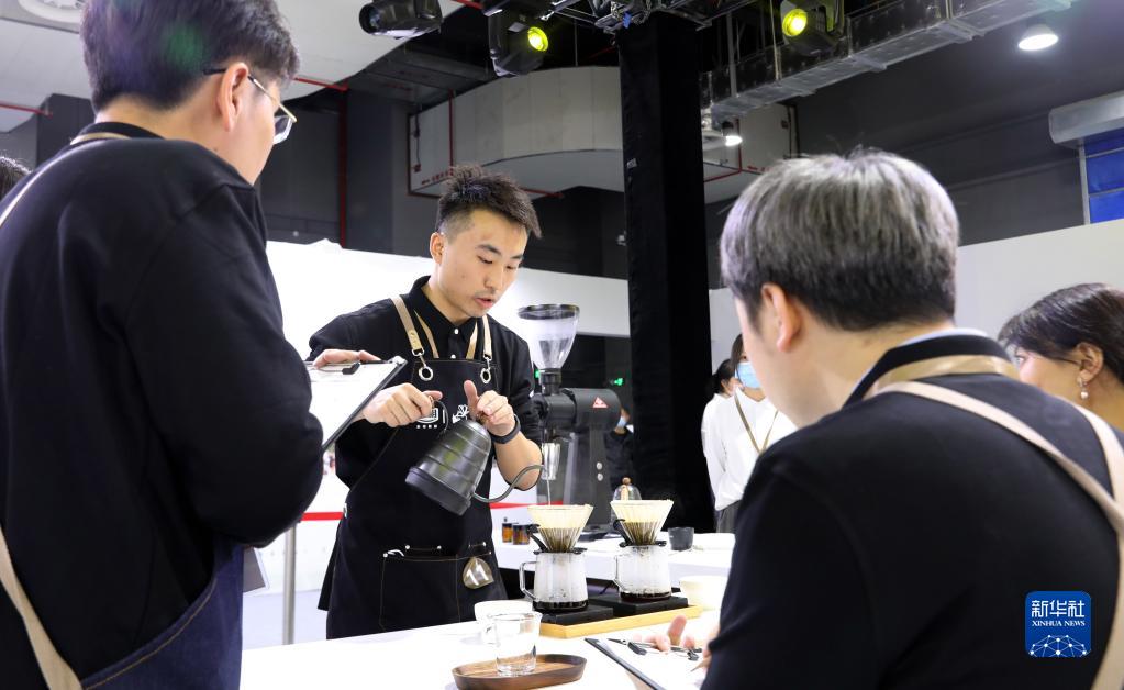 11月20日,一名选手(左二)在手冲咖啡比赛项目中进行演示。