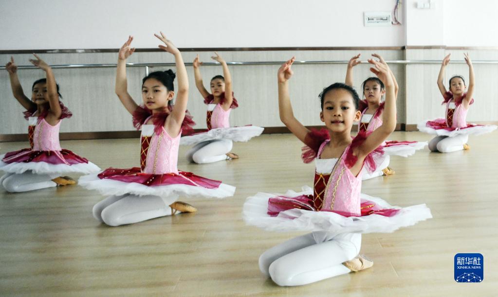当日,在广西钦州市,不少小朋友在家长的带领下来到当地群众艺术馆,跟随老师学习芭蕾舞。她们在练功房挥洒汗水,练习基本功,追逐小小芭蕾梦。