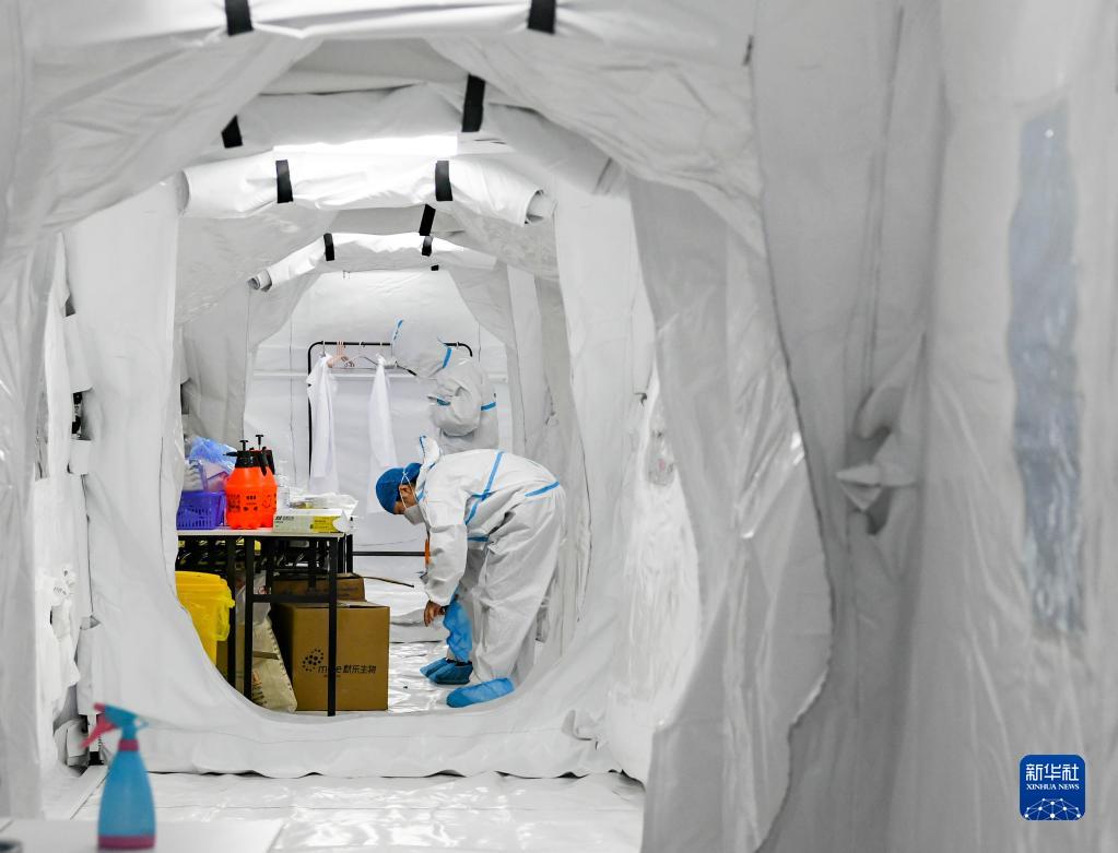 11月12日,工作人员在“猎鹰号”硬气膜实验室走廊穿戴防护装备。