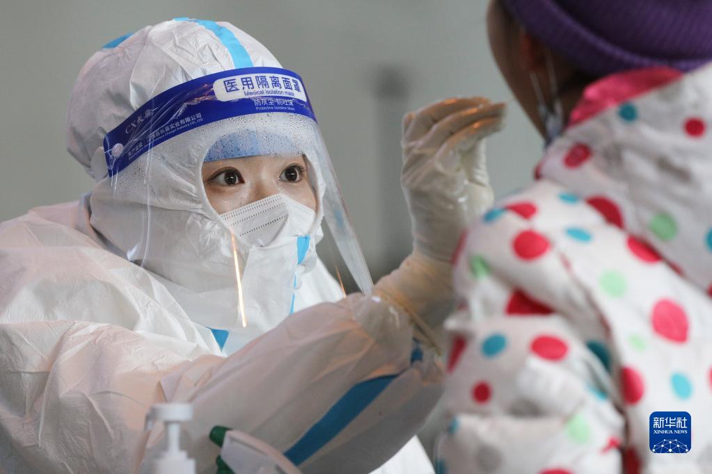 11月15日,在哈尔滨市香坊区安乐街道理工大学核酸检测点,医务人员进行核酸采样。