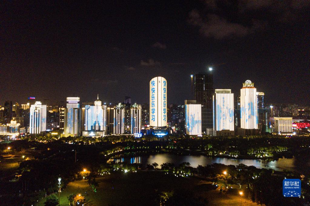 11月20日,海口滨海大道部分楼宇为世界儿童日亮灯(无人机照片)。