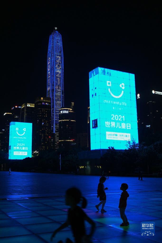 11月20日,深圳市民中心广场、平安国际金融中心为世界儿童日亮灯。