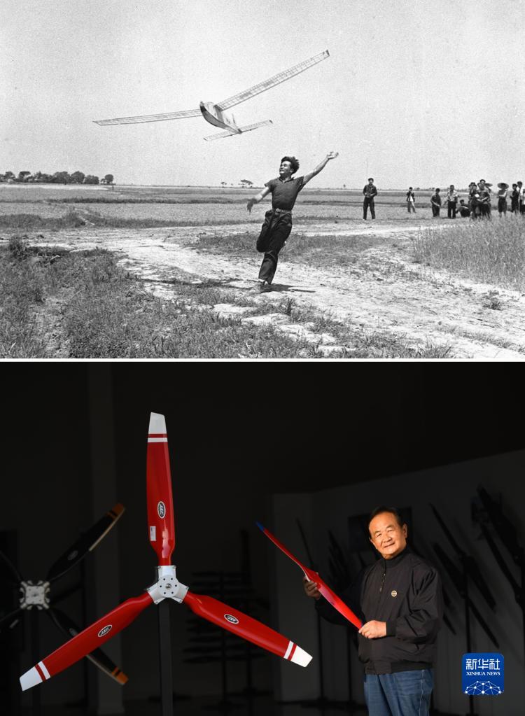 拼版照片:上图为1965年5月31日,河南省航空模型选手南雍(前)在河南省航空模型创纪录测验中(新华社发);下图为2021年11月16日在芜湖拍摄的南雍,他2016年来到安徽芜湖,担任安徽劲旋风航空科技有限公司董事长(新华社记者 张端 摄)。