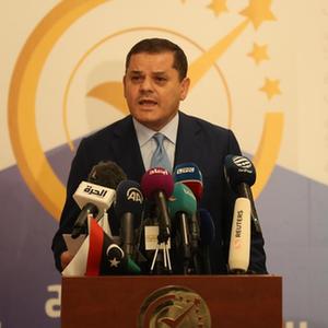 11月21日,利比亚民族团结政府(过渡政府)总理德贝巴在首都的黎波里的国家高级选举委员会与工作人员握手。