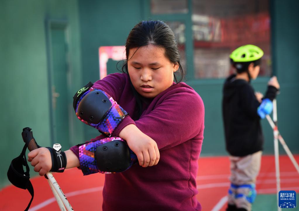 在河南省洛阳市栾川县特殊教育学校操场内,越野滑雪队队员刘娇涵(前)穿戴装备准备训练(11月18日摄)。