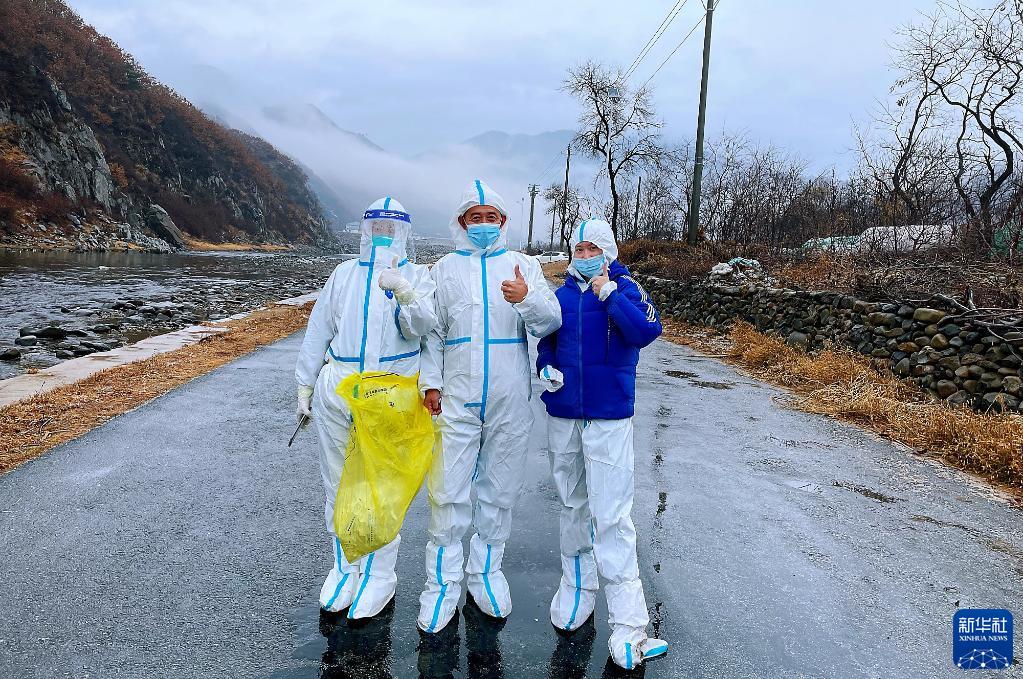 11月10日,医护人员和村镇工作人员在庄河步云山乡步云山村前合影竖起大拇指。