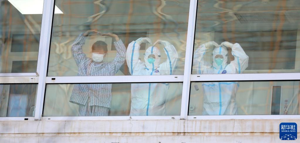 11月19日,两名辽宁省新冠肺炎集中救治大连中心医护人员和一名患者在隔离病房的走廊里向窗外做出爱心手势。