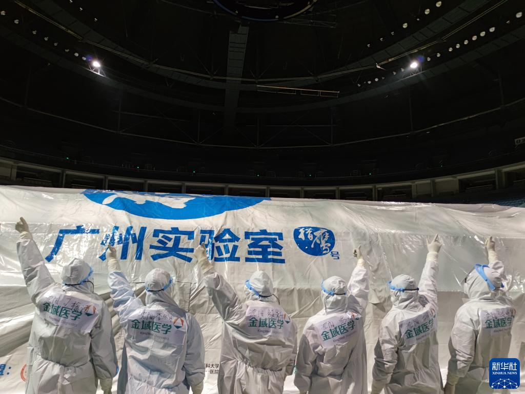11月21日,为大连全市进行核酸检测的“猎鹰号”硬气膜实验室工作人员在气膜实验室前为自己加油打气。