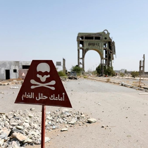 11月21日,车辆行驶在连接也门首都萨那和重要港口城市荷台达的公路上,路边是在战乱中损毁的建筑物。