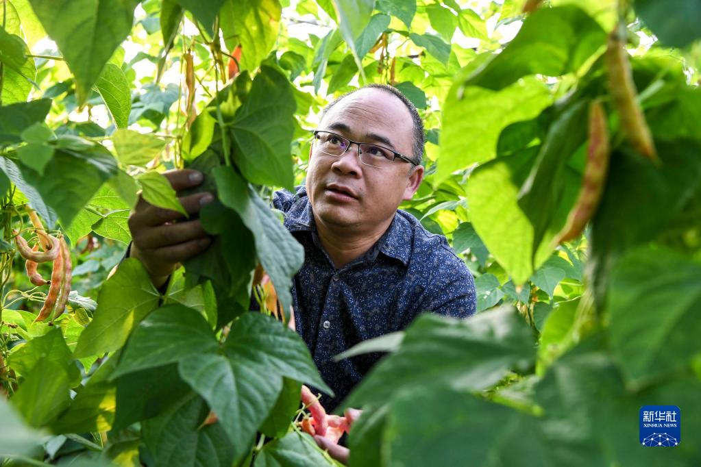 11月23日,在广西武宣县桐岭镇一处蔬菜种植基地内,何开峦在查看豆角长势。