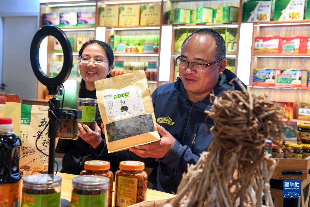 11月23日,在广西武宣县的一家农副产品展销店内,何开峦(右)与工作人员一起直播卖货。