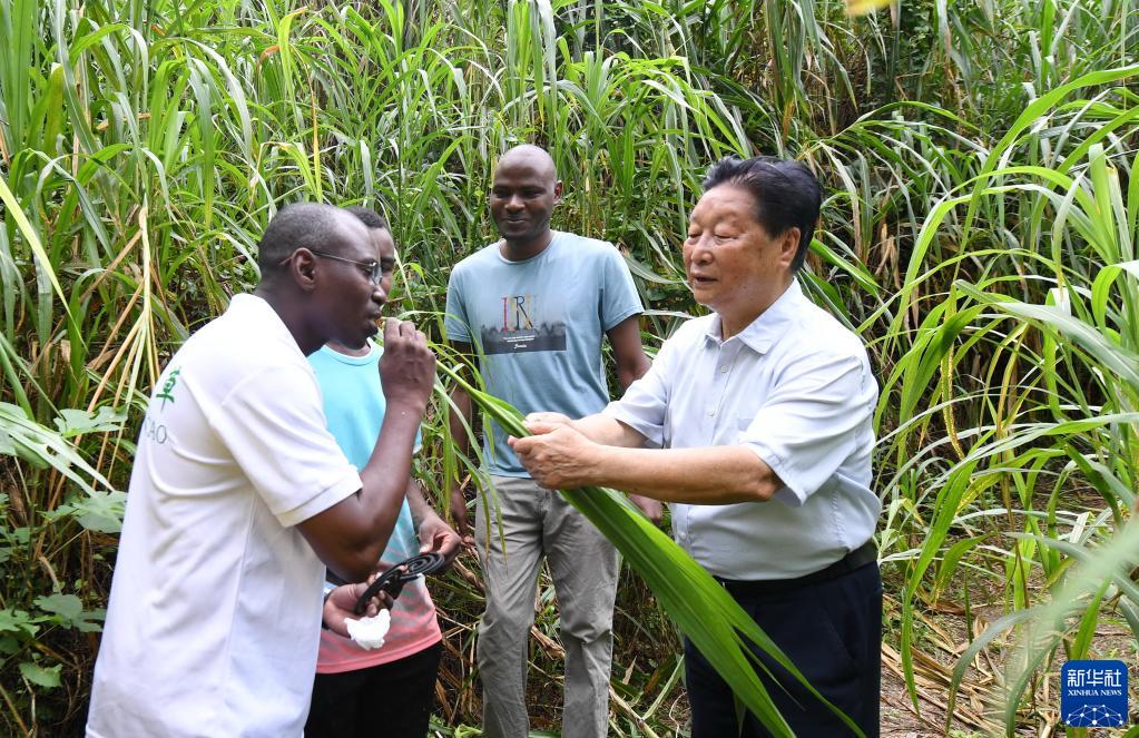 林占熺(右一)在福建农林大学菌草园让尼日利亚留学生试尝幼嫩菌草的味道(8月12日摄)。新华社记者 林善传 摄