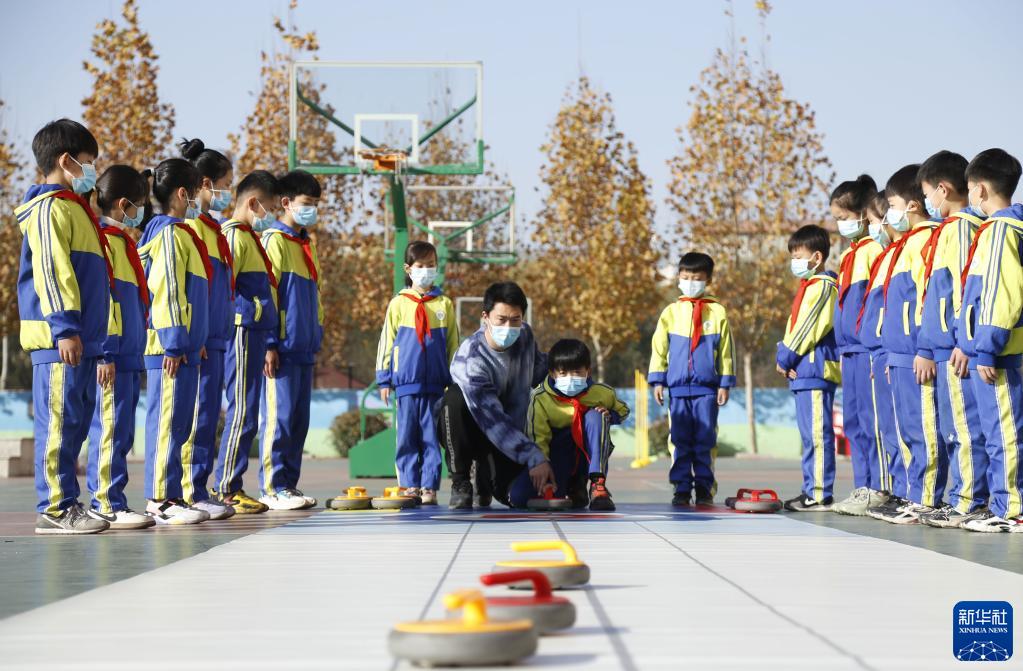 11月24日,邢台市立德小学教师在指导学生练习冰壶。