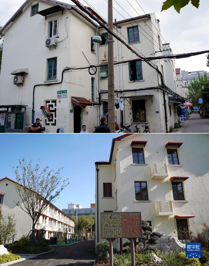 拼版照片:上图是2018年10月11日拍摄的改造前的曹杨一村环境(曹杨新村村史馆提供);下图是10月28日拍摄的完成改造后,架空线入地、外部更新的曹杨一村环境(新华社记者刘颖摄)。新华社发