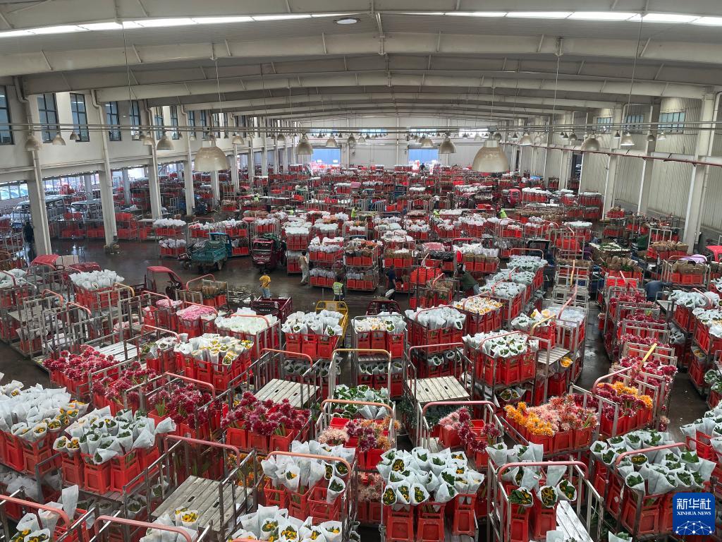 在位于云南省昆明市呈贡区的昆明国际花拍中心,一车车鲜花等待拍卖(8月12日摄)。