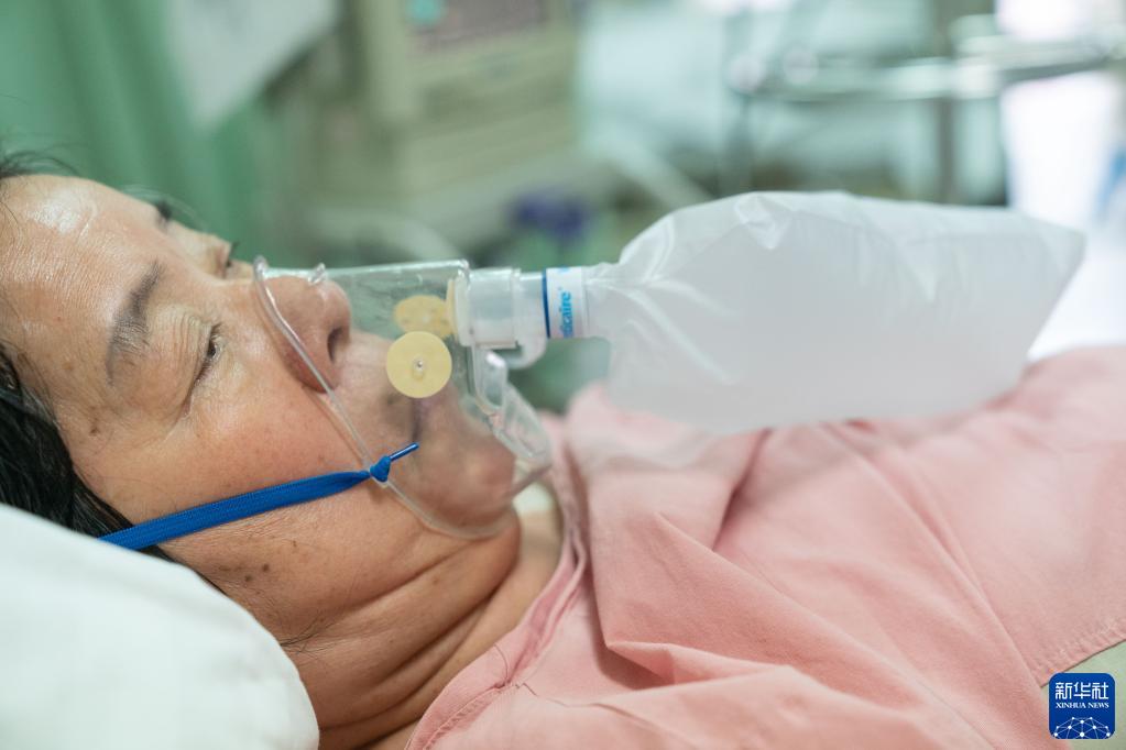 11月18日,在北京大学肿瘤医院肝胆胰外一科病房,沈建群在手术后躺在病床上吸氧。