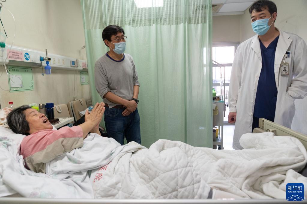 11月24日,在北京大学肿瘤医院肝胆胰外一科病房,即将出院的沈建群(左)向主治医师包全致谢。