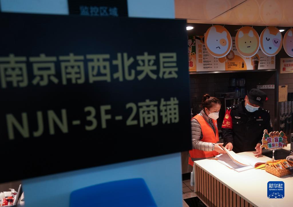 11月25日,民警带着志愿者检查南京南站一家商户的防火巡查记录。