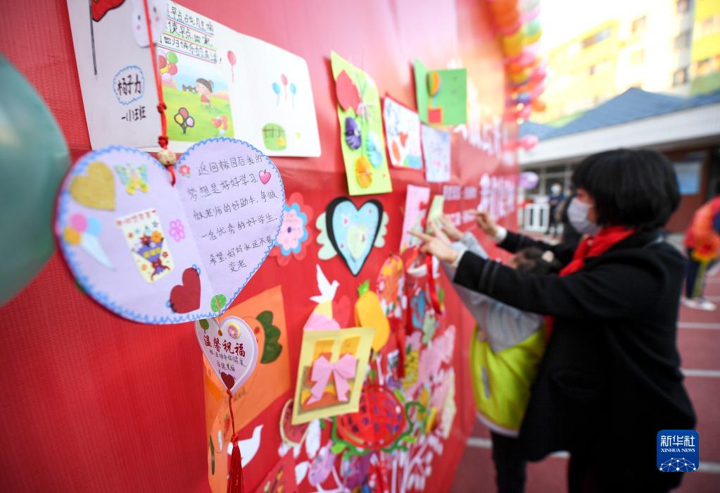 11月25日,宁夏银川市兴庆区第四小学老师帮助学生将复学心愿卡贴在入校心愿墙上。