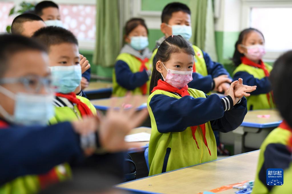 11月25日,宁夏银川市兴庆区第四小学二年级2班学生在课堂上学习防疫洗手方法。