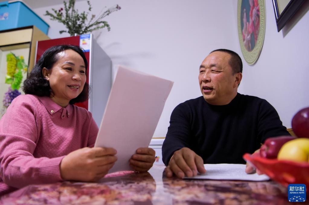 11月24日,在位于包头市青山区的家中,杜海宽(右)在妻子薛利英的帮助下复习业务知识。