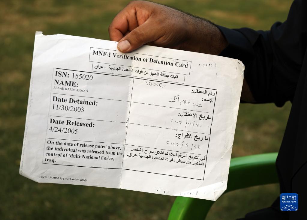 在伊拉克萨拉赫丁省杜鲁亚镇,阿拉·卡里姆·艾哈迈德展示被释放时的证明(11月2日摄)。