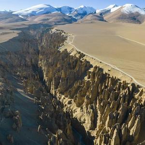 奇林峡位于西藏日喀则市定结县琼孜乡,经万年冰川雪水冲刷,形成如今独特的自然景观。远方皑皑雪山,谷内土林形状奇特,吸引游客前来观光。