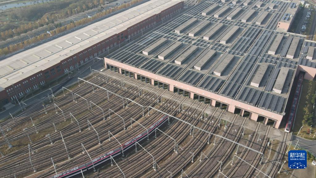 11月26日拍摄的合肥市轨道交通1号线珠江路车辆段运用库屋顶的分布式光伏发电站(无人机照片)。
