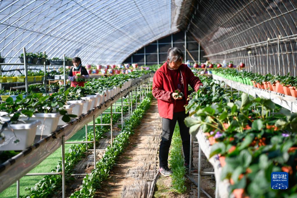 11月26日,在隆化县七家镇一处草莓种植基地,工人在管护盆栽草莓。