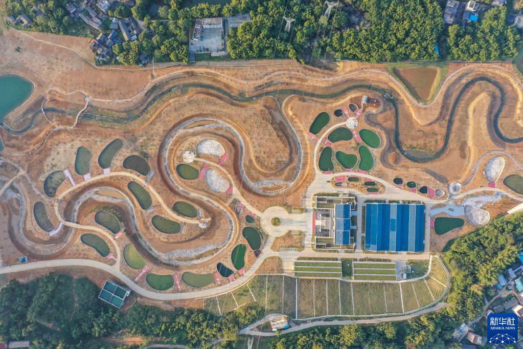 这是已经投入使用的南木江副坝仿生态过鱼通道和大藤峡鱼类增殖放流站(11月26日摄,无人机照片)。新华社记者 曹祎铭 摄