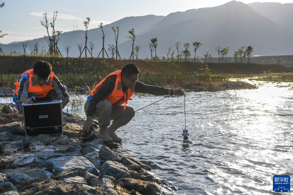 11月26日,技术人员向南木江副坝仿生态过鱼通道内投放监测用的水下摄像头。新华社记者 曹祎铭 摄