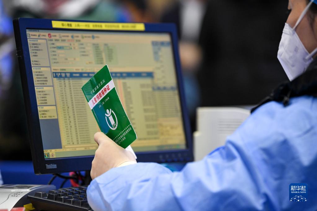 11月27日,在银川市金凤区新冠疫苗方舱接种点,医务人员根据预防接种证登记儿童信息。