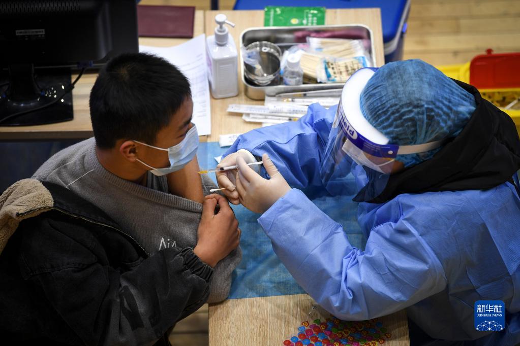 11月27日,在银川市金凤区新冠疫苗方舱接种点,医务人员为儿童接种疫苗。