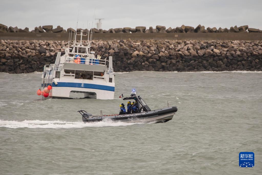 这是11月26日在法国加来港拍摄的一艘参加抗议活动的法国渔船(左)。新华社发