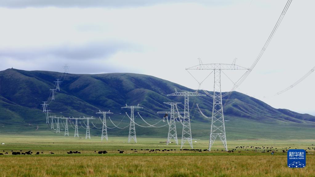 这是6月17日在青海省黄南藏族自治州河南蒙古族自治县拍摄的青豫特高压直流工程。新华社发 (谢莉蓉 摄)