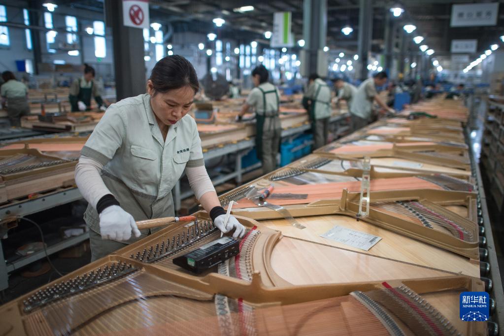 11月23日,工人在柏斯音乐集团宜昌钢琴生产基地进行钢琴部件安装。