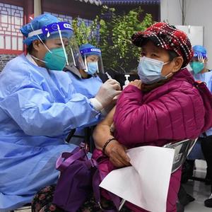 11月29日,在羊坊店街道铁西社区新冠疫苗临时接种点,医护人员(前左)为社区居民接种新冠疫苗加强针。