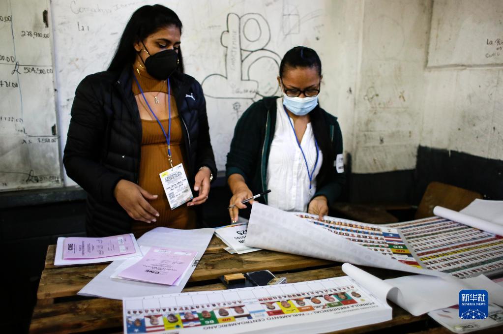 11月28日,在洪都拉斯首都特古西加尔巴,工作人员在检查选票。