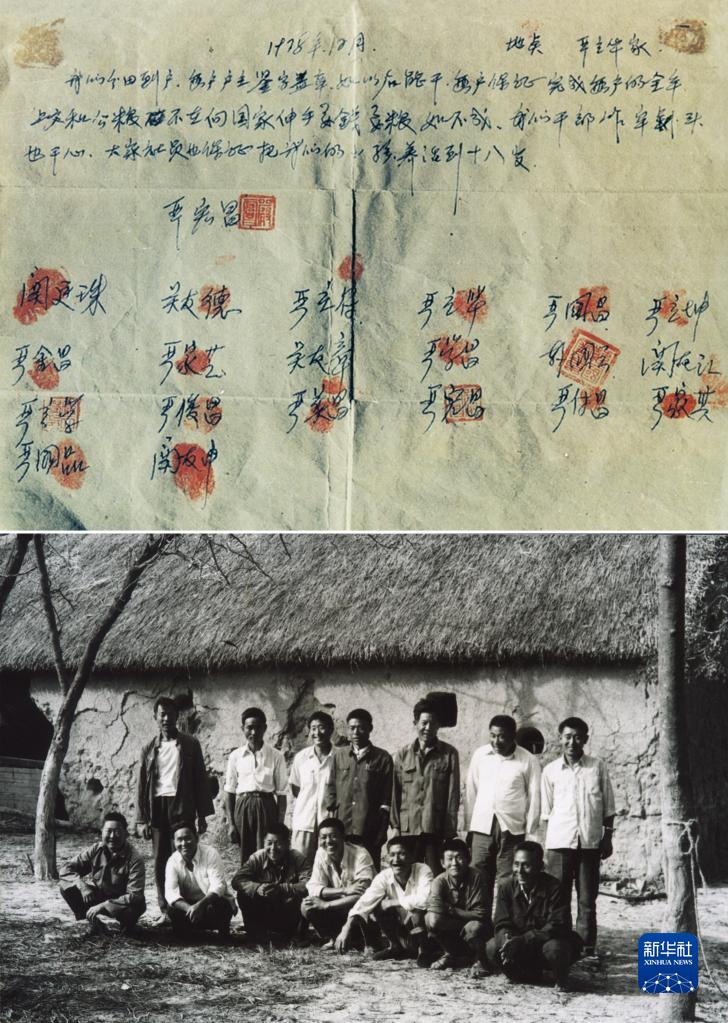 这是一张拼版照片:上图为1978年冬,18位农民按下红手印的“大包干”契约(资料照片);下图为1981年,部分“大包干”带头人在茅草屋农舍前合影(资料照片)。
