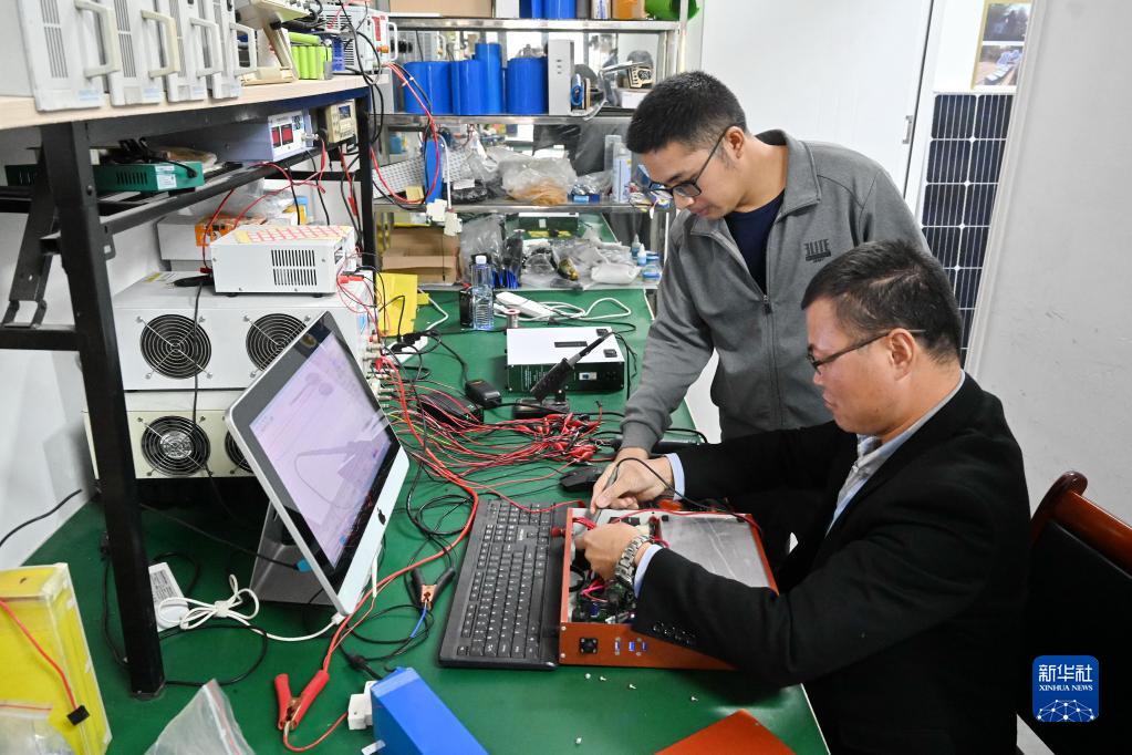 合伙创业者在位于晋江市创新创业创造园的晋江纳创新环境技术有限公司研发室检测太阳能储能电源数据(11月26日摄)。