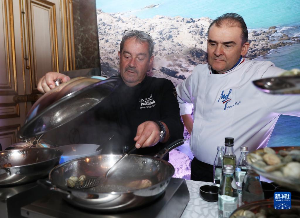 11月29日,在位于巴黎的法国外交部举行的LA LISTE国际美食榜单揭晓活动现场,一家法国餐厅的大厨现场制作海鲜美食。