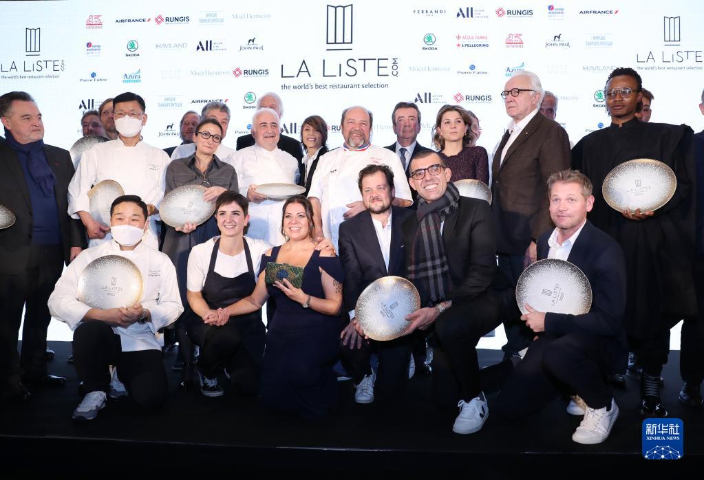 11月29日,在位于巴黎的法国外交部举行的LA LISTE国际美食榜单揭晓活动现场,获奖厨师合影留念。