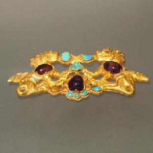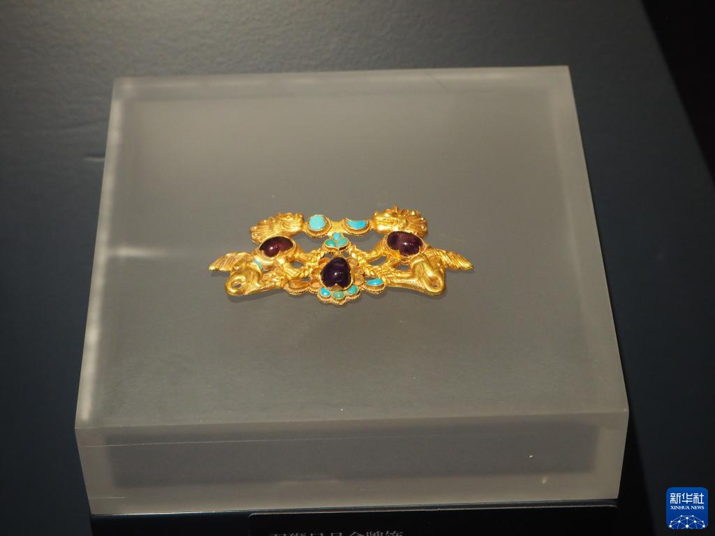 出土于2018血渭一号墓的双狮日月金牌饰(11月24日摄)。