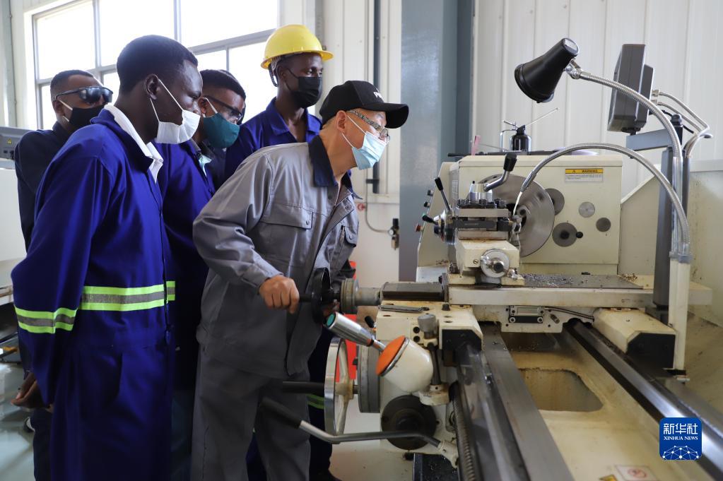 2021年11月9日,在位于乌干达中部穆科诺地区纳曼韦工业园的中国援乌工业技能培训与生产中心,一名中方导师为学员演示如何操作机械。新华社记者 张改萍 摄