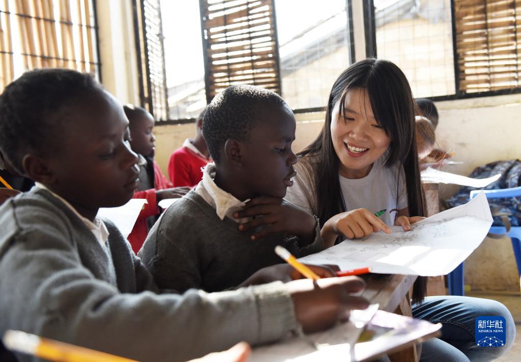 2016年8月2日,在肯尼亚内罗毕马萨雷,一名志愿者(右一)给学生们上课。新华社记者 李百顺 摄