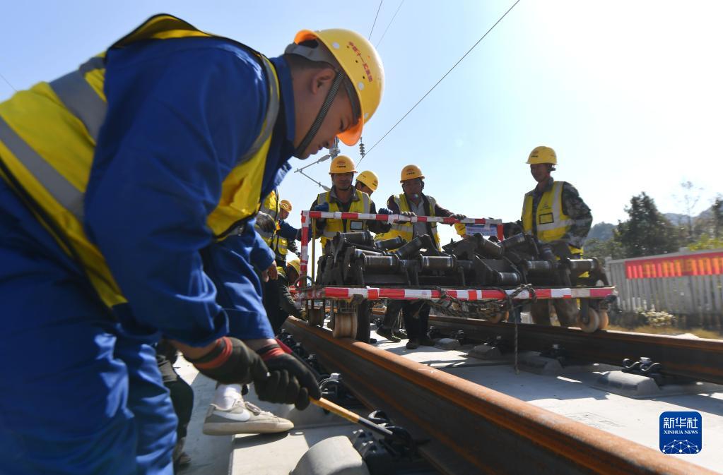 12月1日,施工人员在常益长高铁黄桥大道特大桥铺轨现场施工。