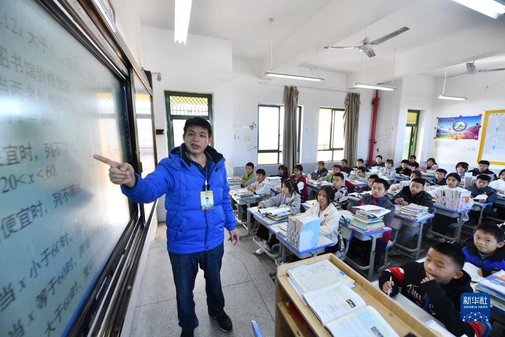 在广西融水苗族自治县思源实验学校,来自廉江市石颈镇第一初级中学的支教老师林鹏在上课(12月1日摄)。