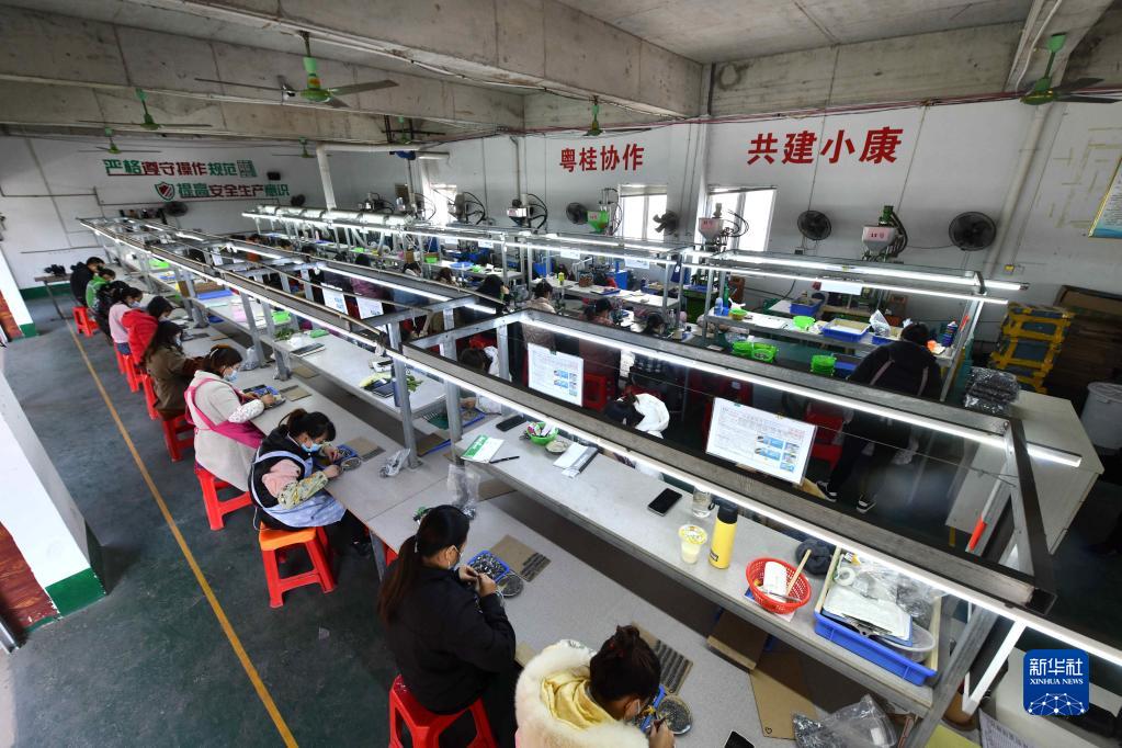 工人在广西融水苗族自治县苗家小镇小区的粤桂扶贫车间生产电子配件(12月1日摄)。